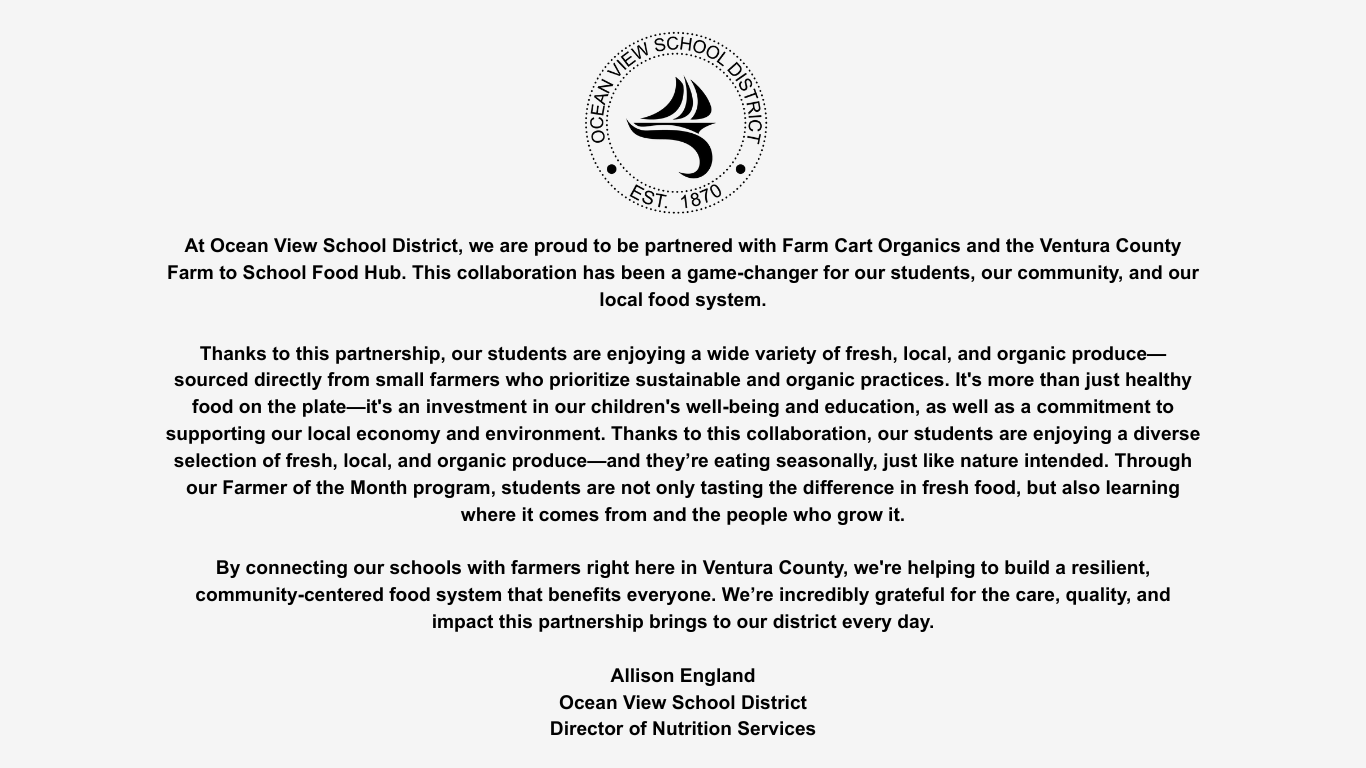 We are a transparent, purpose-driven food hub based out of Carpinteria, CA. We are dedicated to bringing the freshest, most nutrient dense, farm foods to families in Ventura and Santa Barbara Counties. We have partnered with farmers who share the same dedication to creating a healthier, happier planet and community by supporting biodiversity, workers rights, and regenerative practices with every seed they sow. Join our family as we and our farmers work diligently to do the very best we can in the vital organic world.